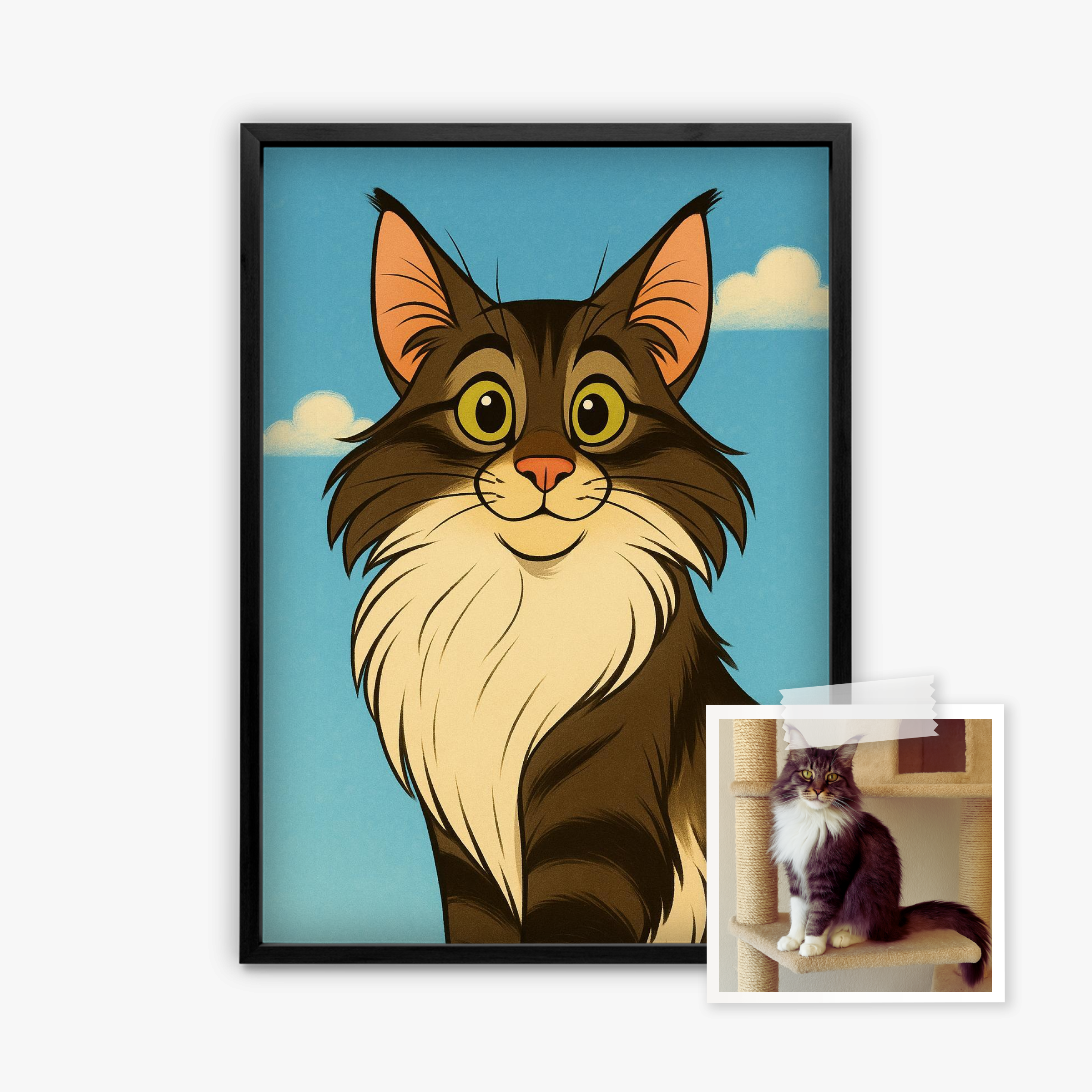 Il a ce petit quelque chose d'intemporel, ce charme rétro qu'on croirait tout droit sorti d’un dessin animé du samedi matin, version années 70. Avec ses grands yeux émeraude remplis de malice et sa frimousse de chaton espiègle, ce portrait personnalisé de chat réinvente l’art animalier avec tendresse et second degré. Le fond bleu ciel, les nuages cotonneux, et ce style graphique vintage évoquent des souvenirs doux et réconfortants, comme une madeleine de Proust féline. Et si ton matou devenait la star d’un classique animé ? C’est exactement ce que notre équipe d’artistes français rend possible, en transformant ton animal de compagnie en personnage culte… et complètement irrésistible.